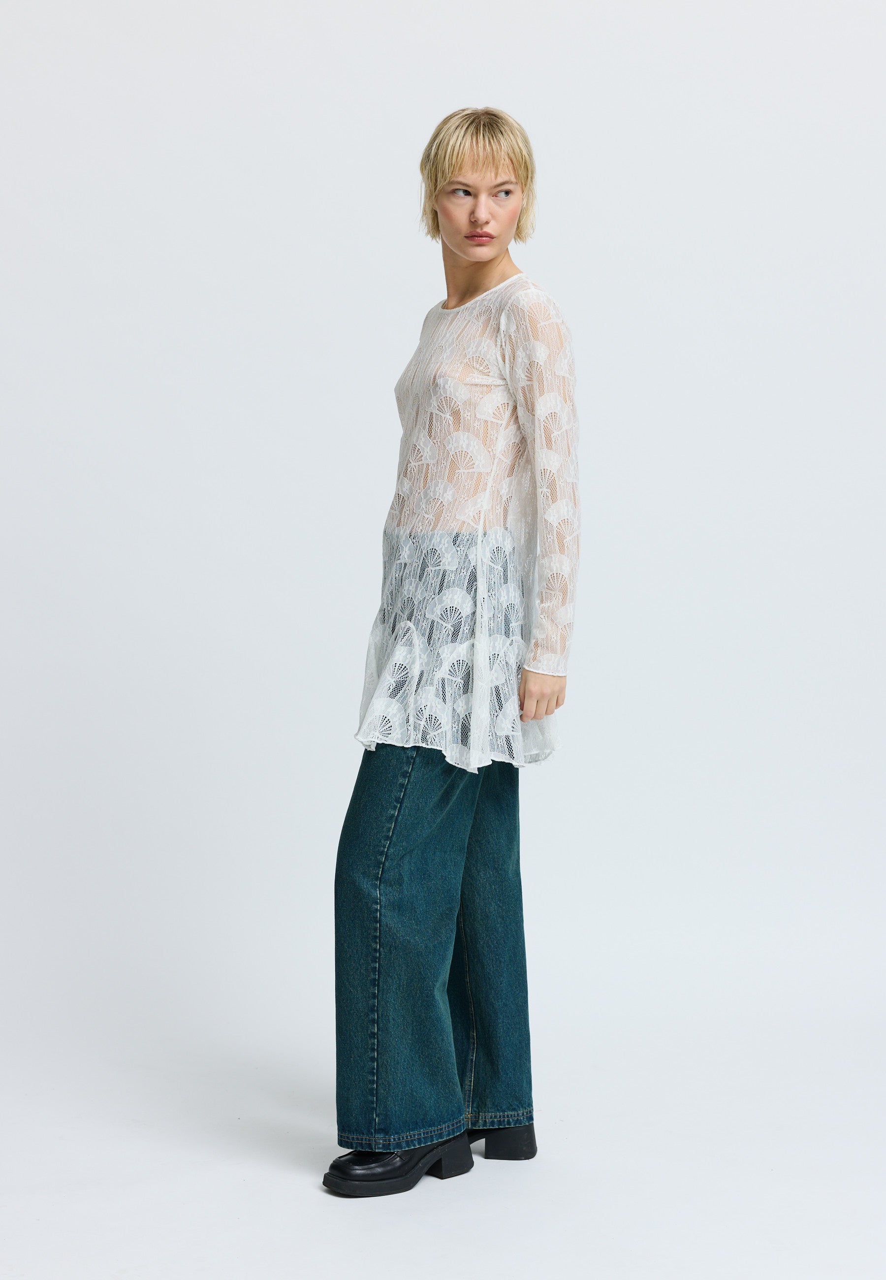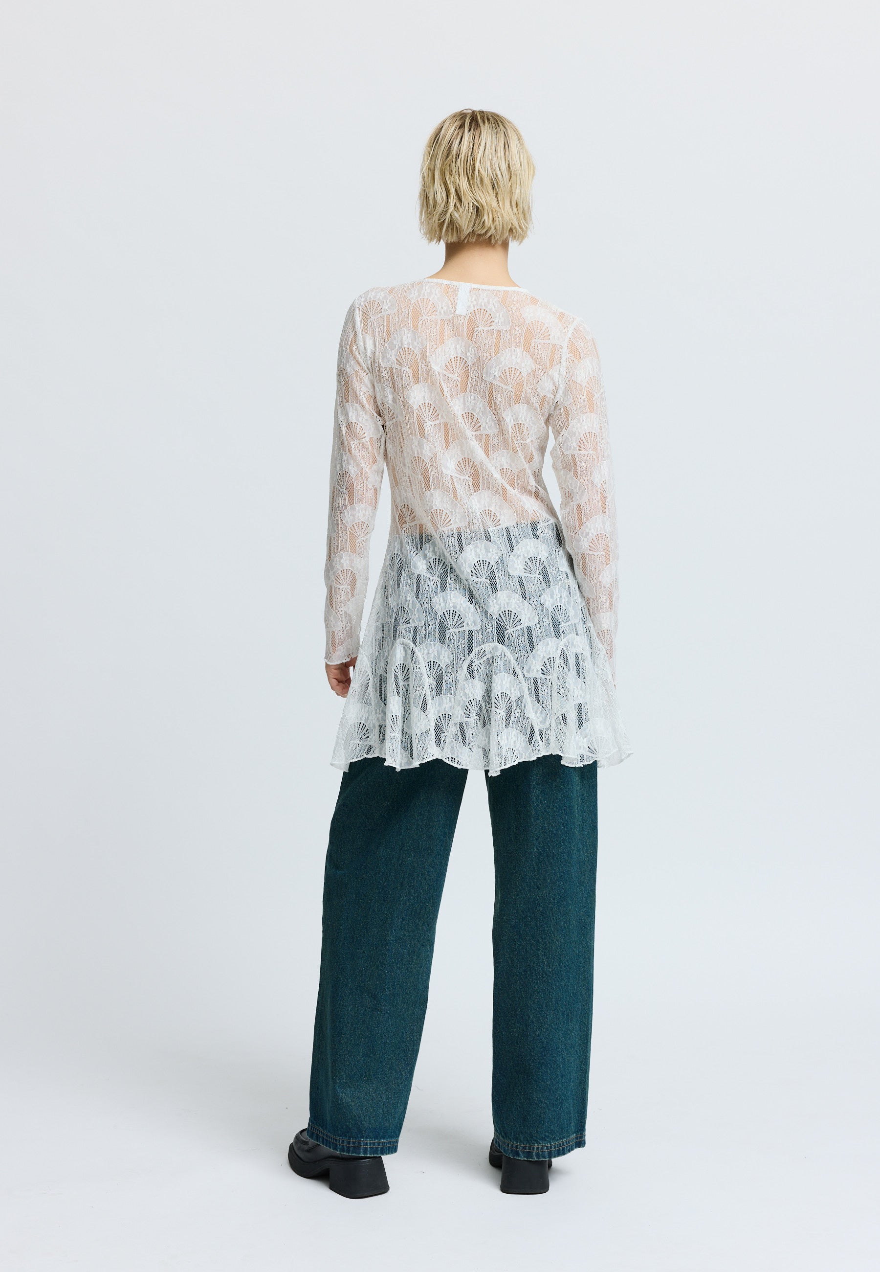 Short casual fitted lace dress with volume at bottom.