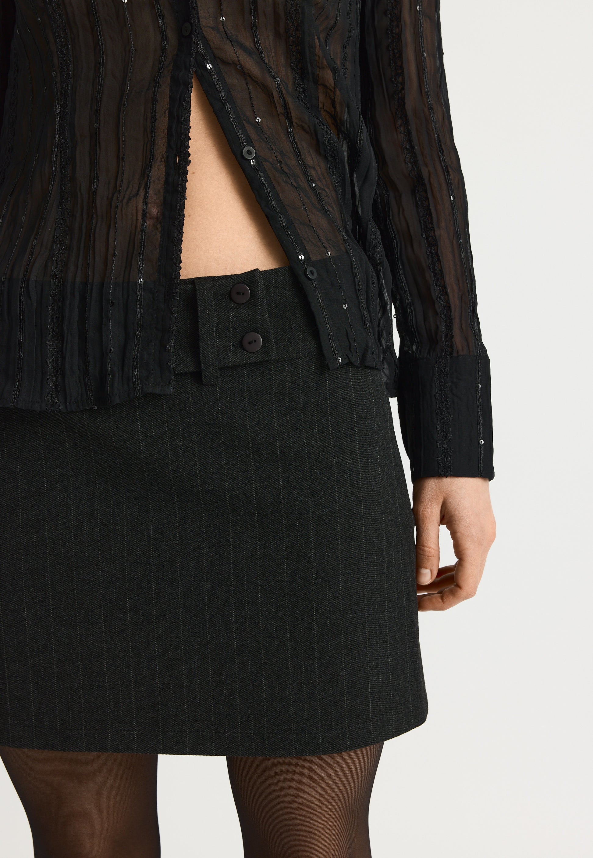 Short suit skirt in pinstripe with belt detail and side seam zipper.