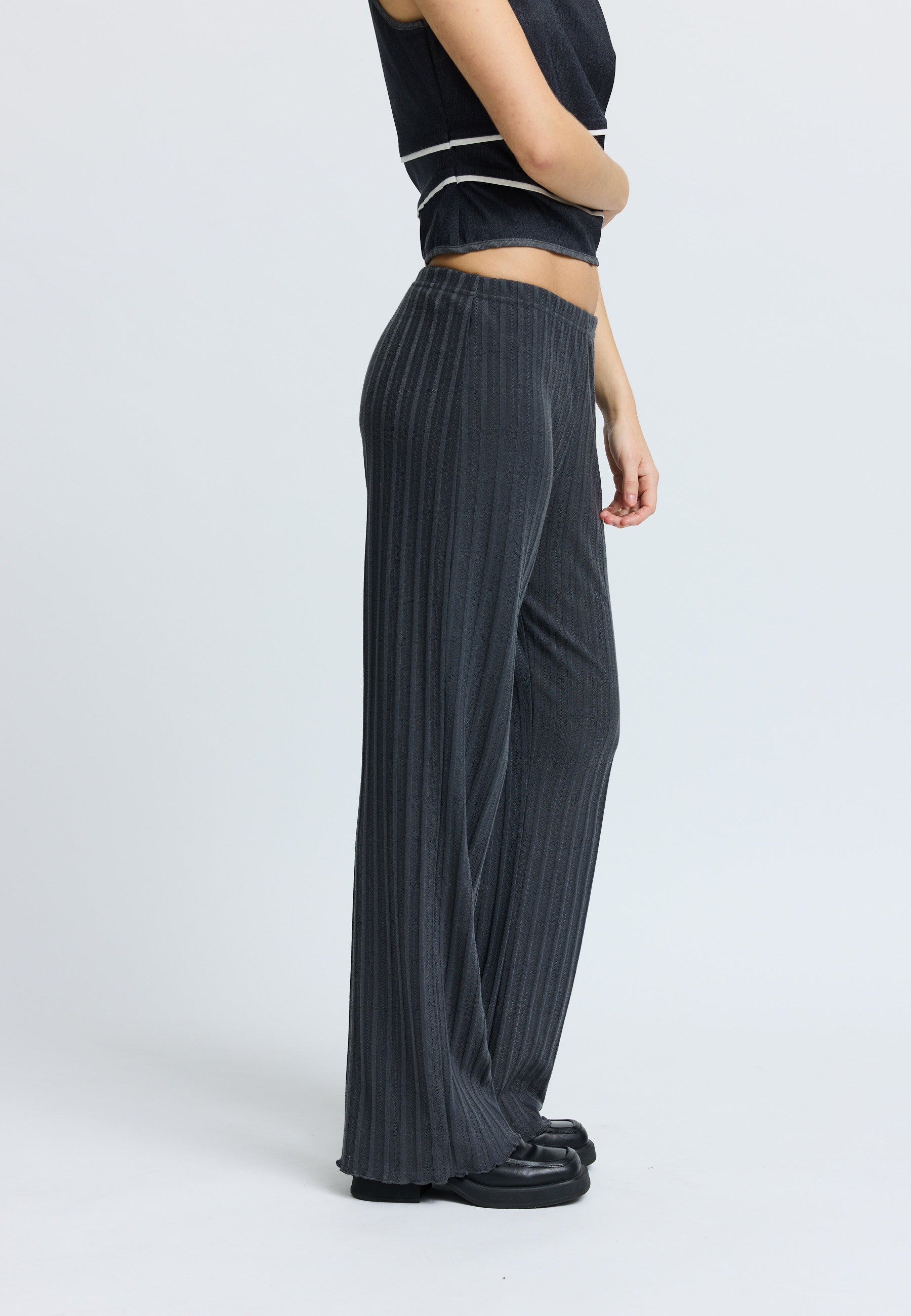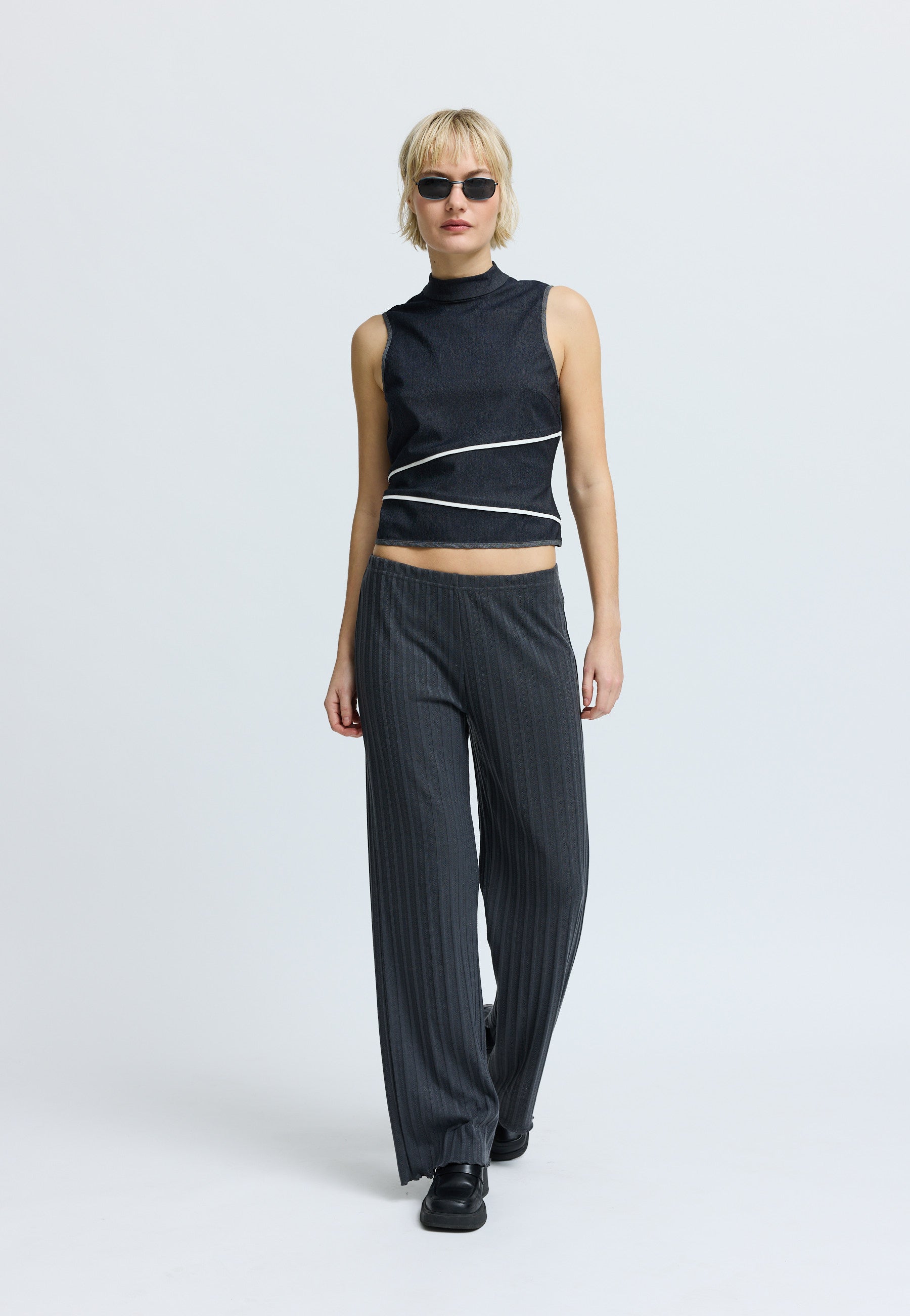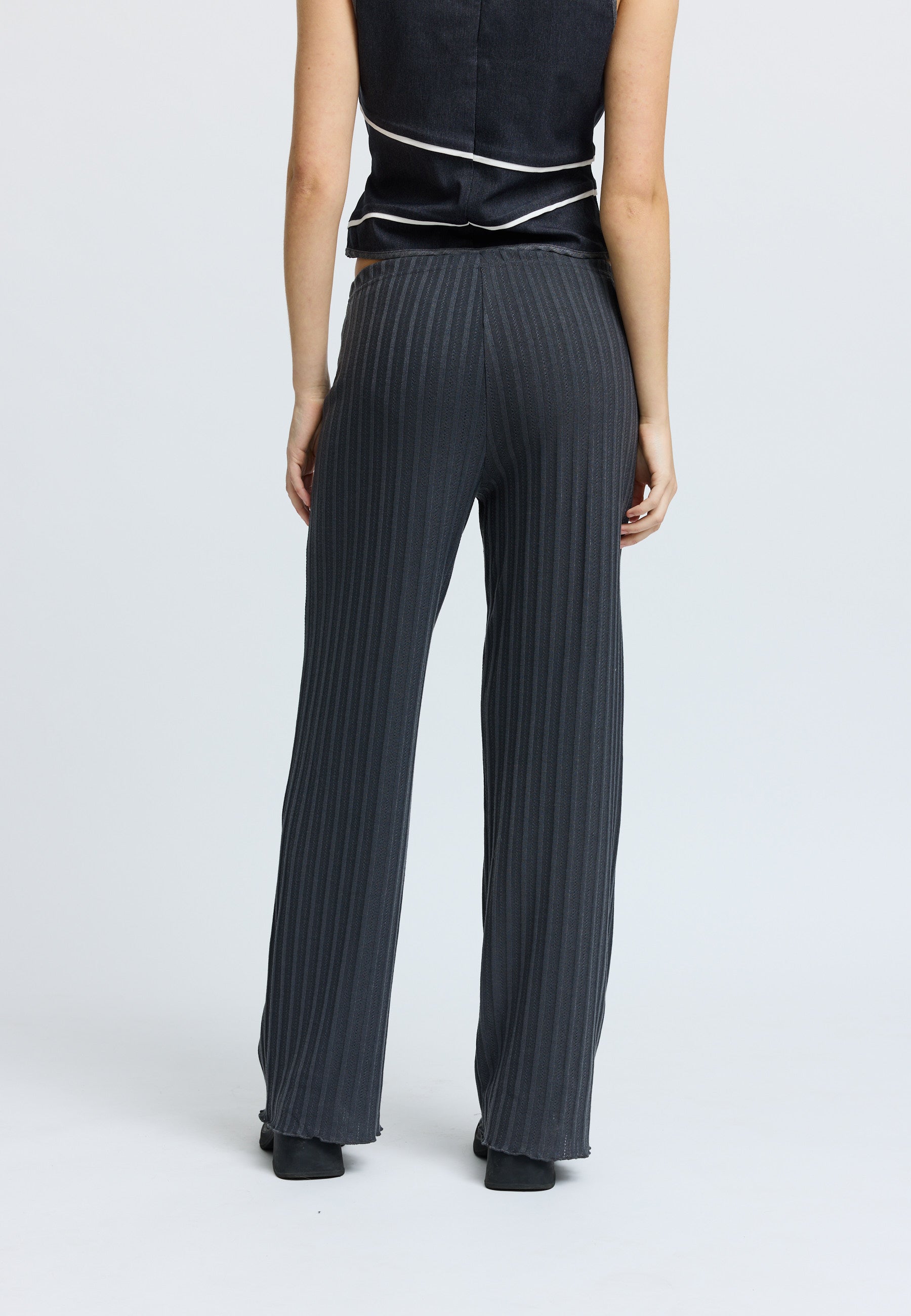Straight leg casual pant in fabric with structure and elastic at waist.