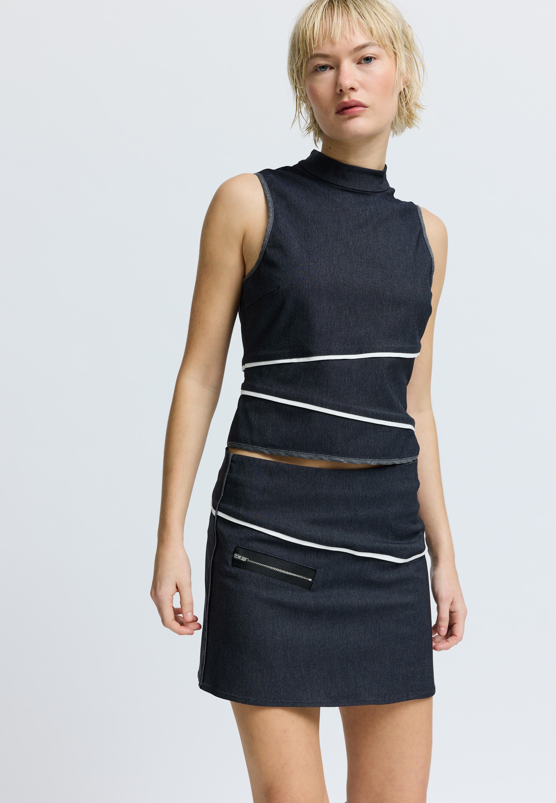Fitted top in denim look with cutlines and zipper at back.