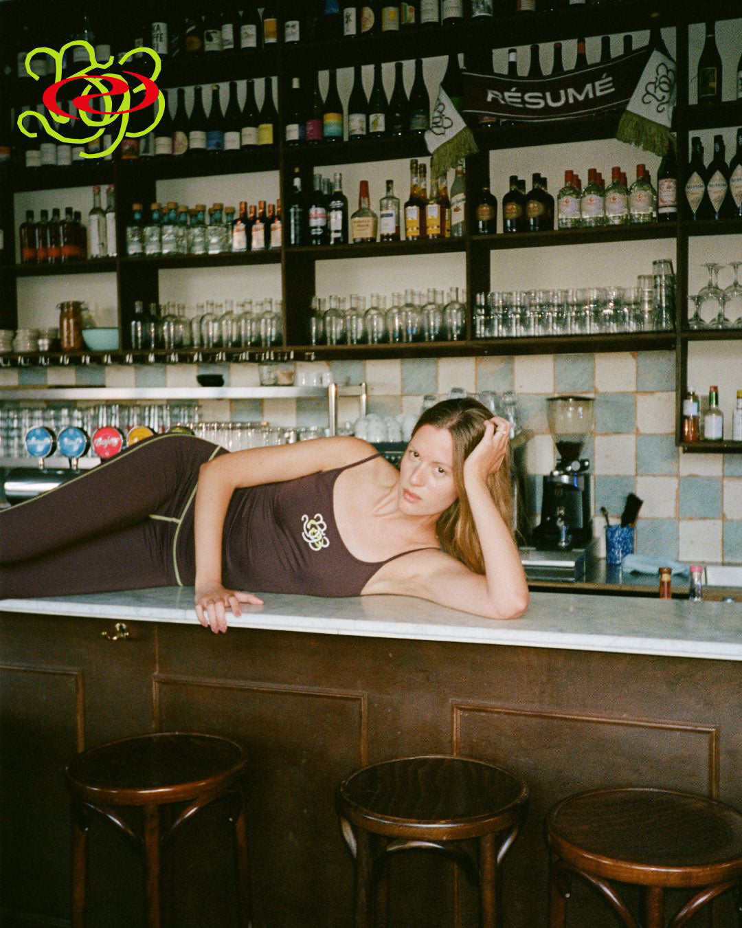 RSM ACTIVE flared pant with contrast stitching and Resume© x B93 collab print on back.