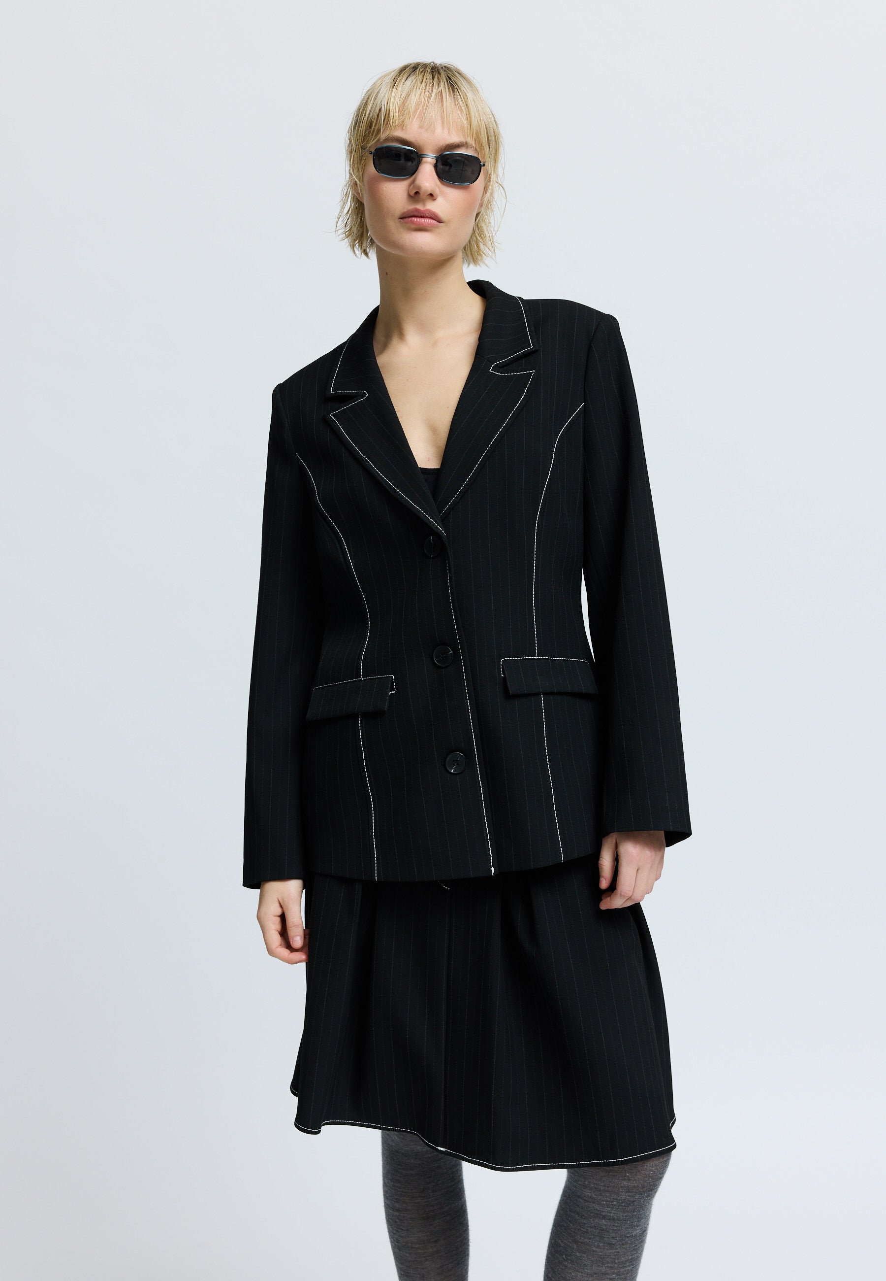 Casual fitted blazer in pinstripe with contrast white stitches.