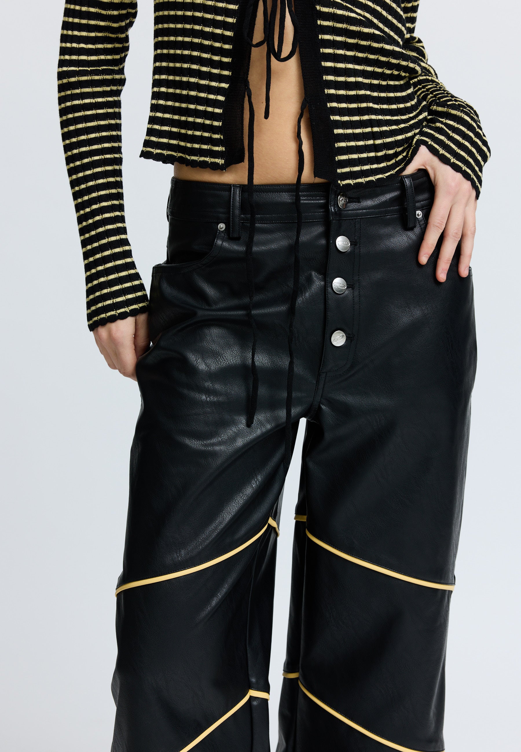 Casual fitted PU pant with yellow piping detail and Résumé buttons at fly.