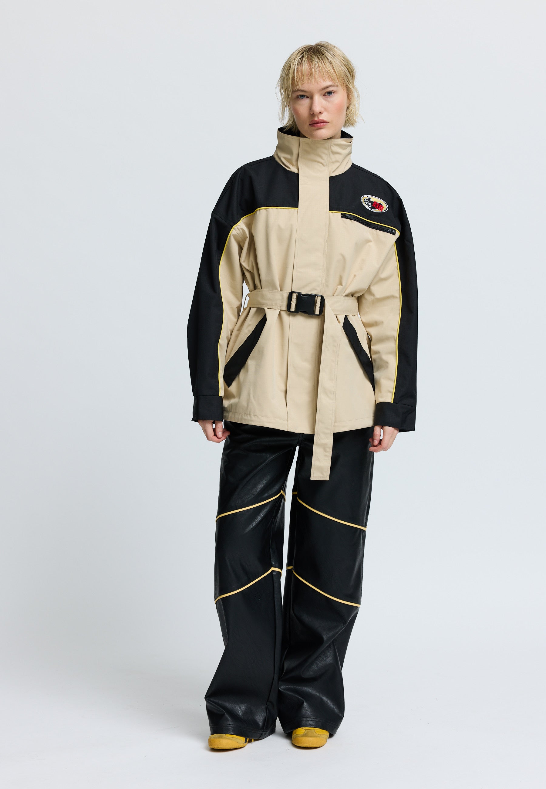 Outdoor jacket in rib stop quality with contrast yoke, cuffs and velcro details. Press buttons and zip behind placket down center front. Hoodie hidden inside neck. Drawstring at bottom hem that can be tightened and belt at waist. Water and wind resistant.