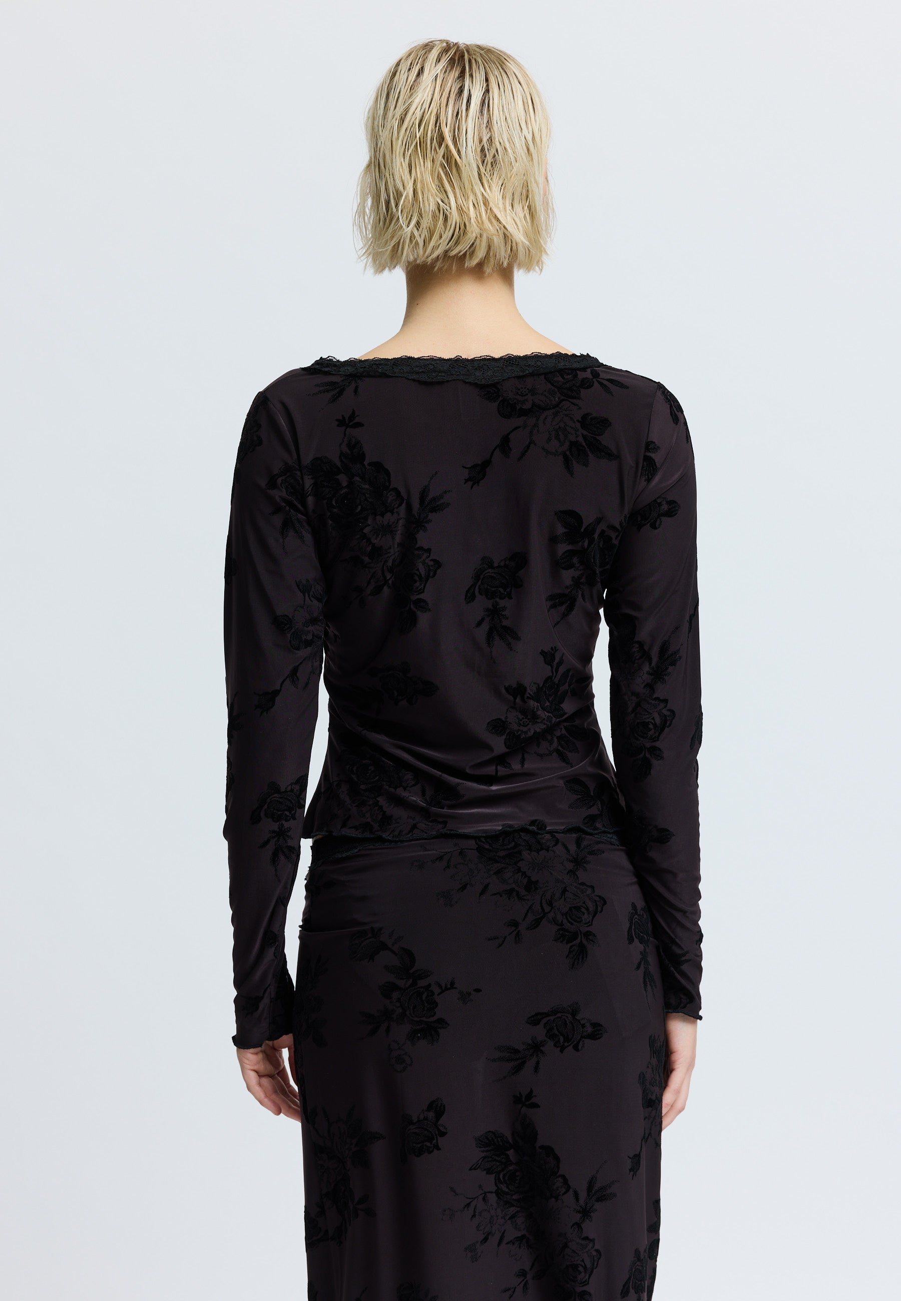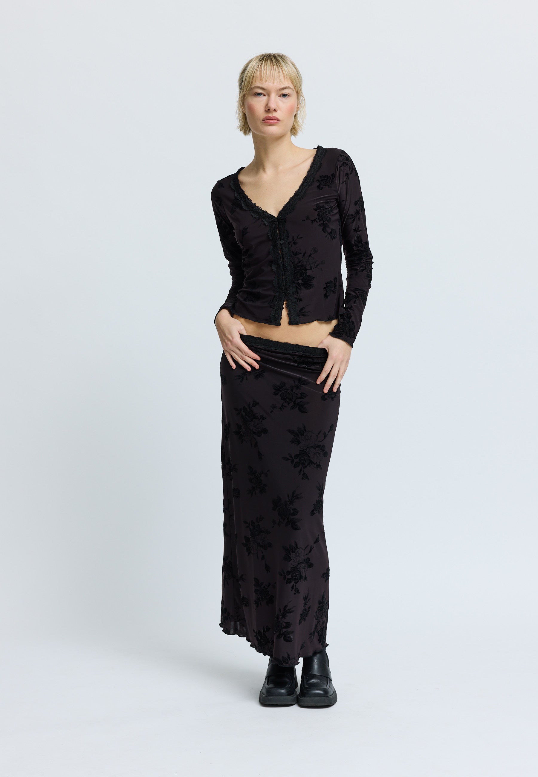 Fitted v-neck jersey cardigan with all-over print and decoration band.