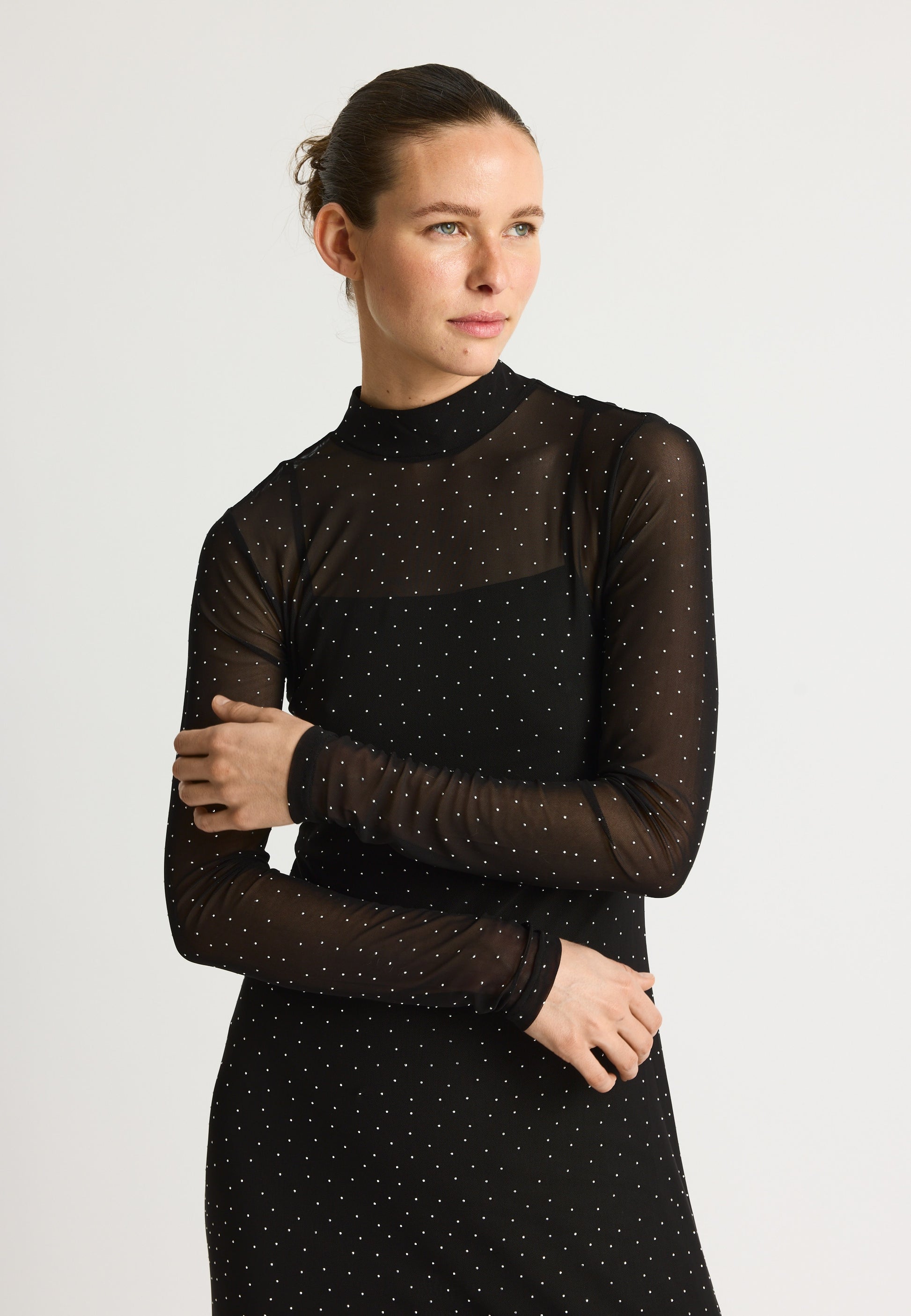 Long fitted mesh dress with rhinestones, high neck and zipper at back. Dress comes with detachable lining dress.