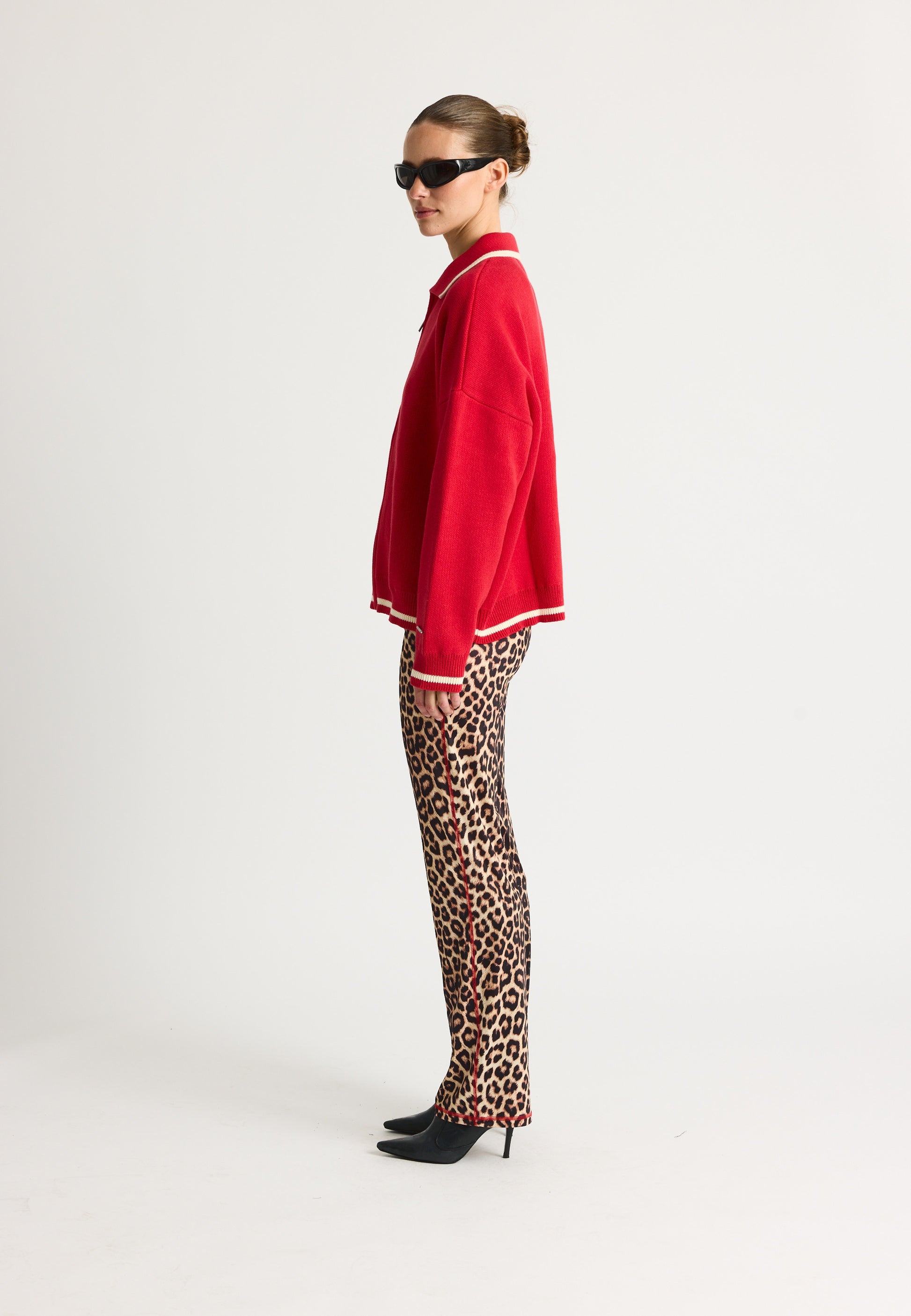 Oversized knit zip with white contrast details, and logo metal charm at sleeve.