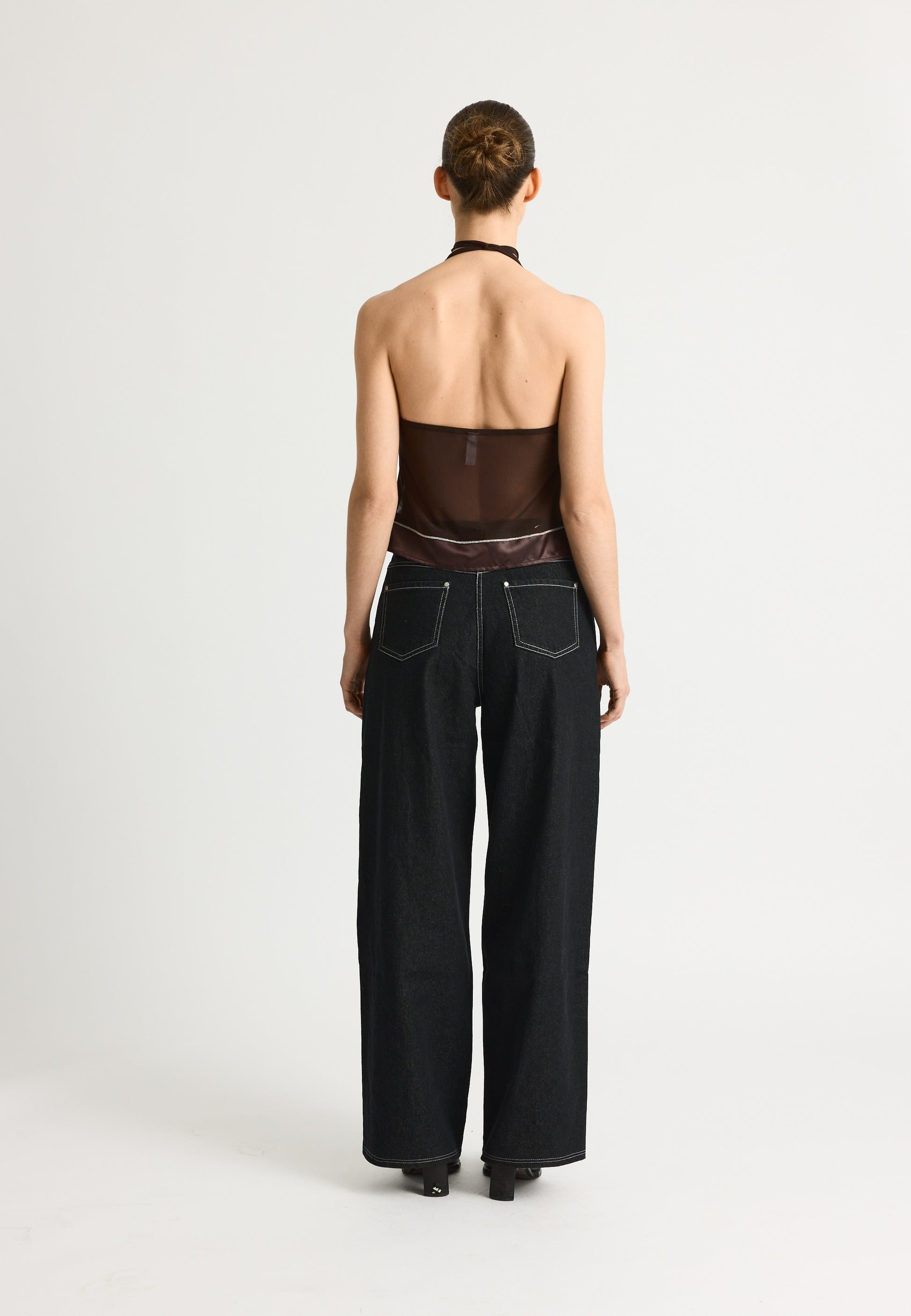 Halter-neck mesh top with strings and decoration band at bottom hem with pearls.