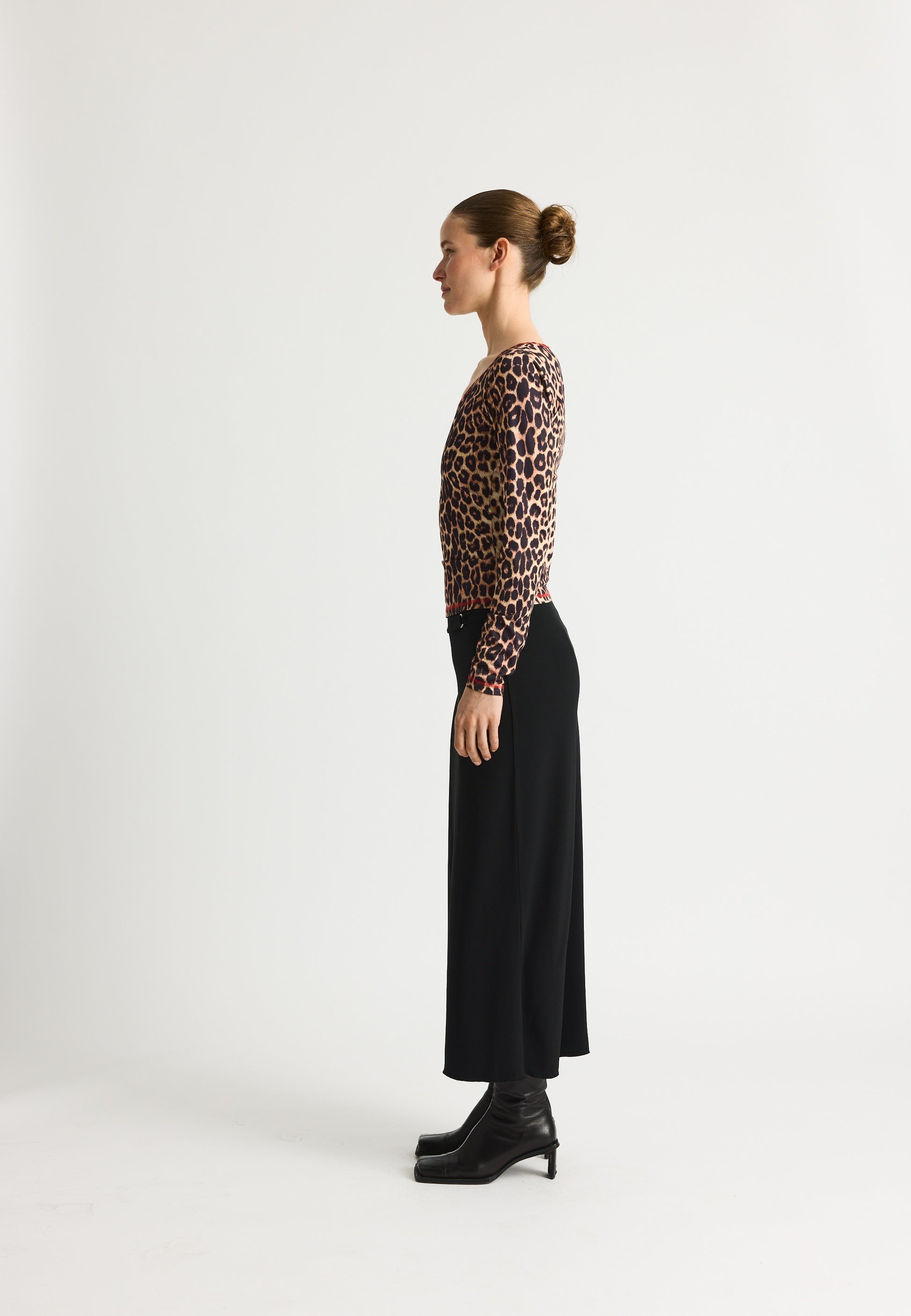 Long mid-waist jersey skirt with heart shaped snap hook at front.